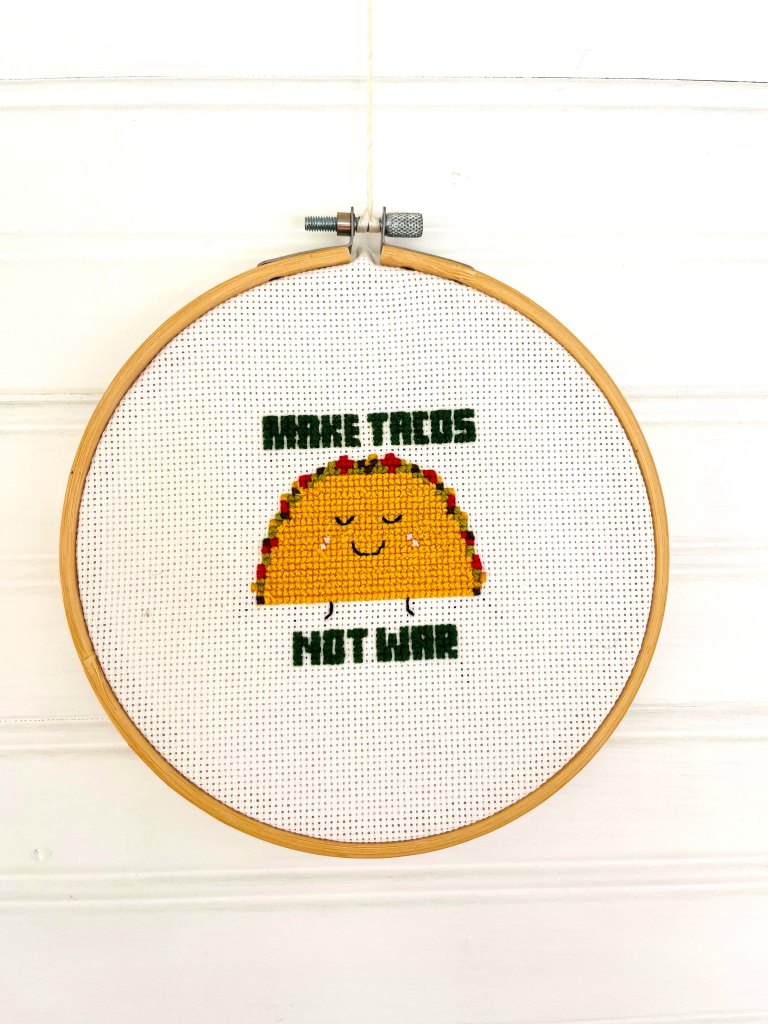 It’s hanging on our front porch. It makes me smile. Like the taco I cross-stitched.